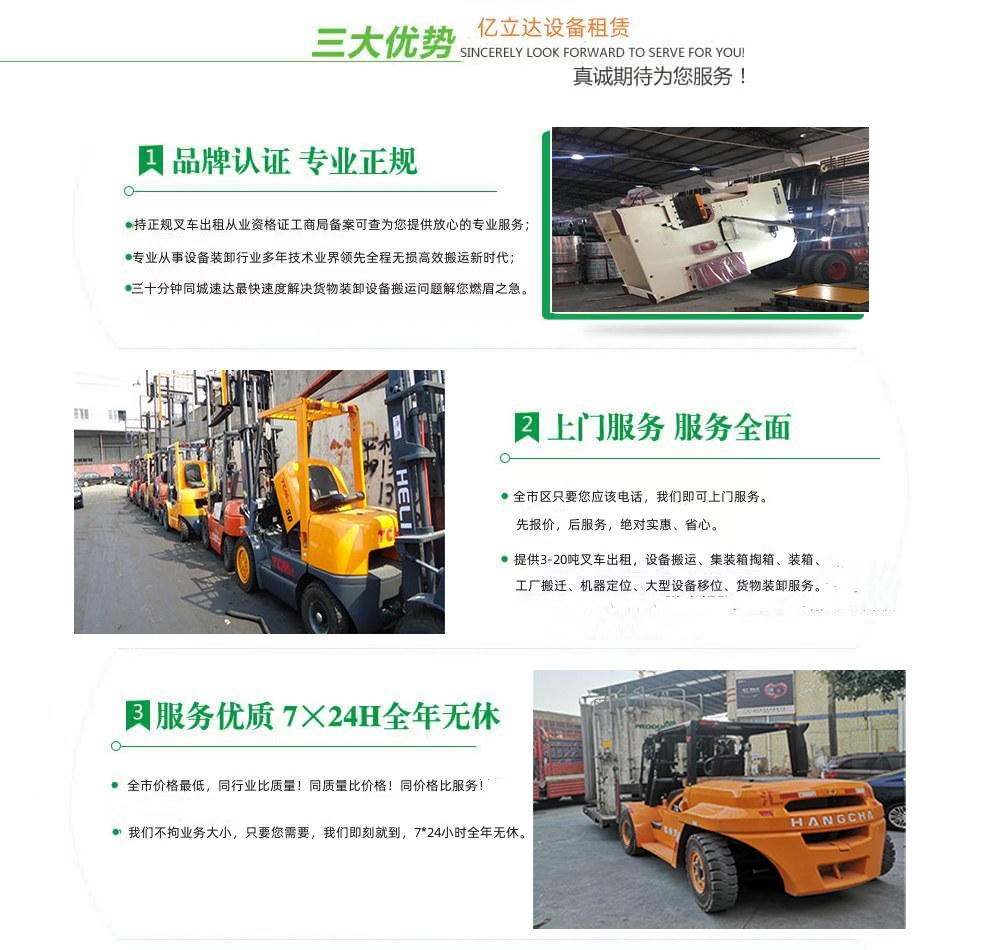 亿立达设备租赁有限公司是工商局准许的北京科技职业学院专业叉车出租公司,公司本着诚信、服务、效率、创新的经营理念,用精湛的技术,真诚的服务,为众多客户提供优质的服务,同时获得信赖与支持。专业提供北京科技职业学院3-20吨叉车出租、叉车租赁、设备搬运、集装箱掏箱装箱、机器移位定位、货物装卸、工厂搬迁、安全可靠,收费透明,价格便宜,随叫随到,24小时上门服务!本公司叉车吊车师傅对各种设备搬运装卸都有深刻探讨和研究。很多的疑难设备搬运,通过我公司的叉车师傅都能迎刃而解。对各种进口设备、国产机器、大型设备搬迁、高难度搬迁、各种精密仪器、医疗设备、科研设备等都能搬运; 提供全市 24 小时上门装卸搬运服务。同时提供厂房搬迁服务。 ...